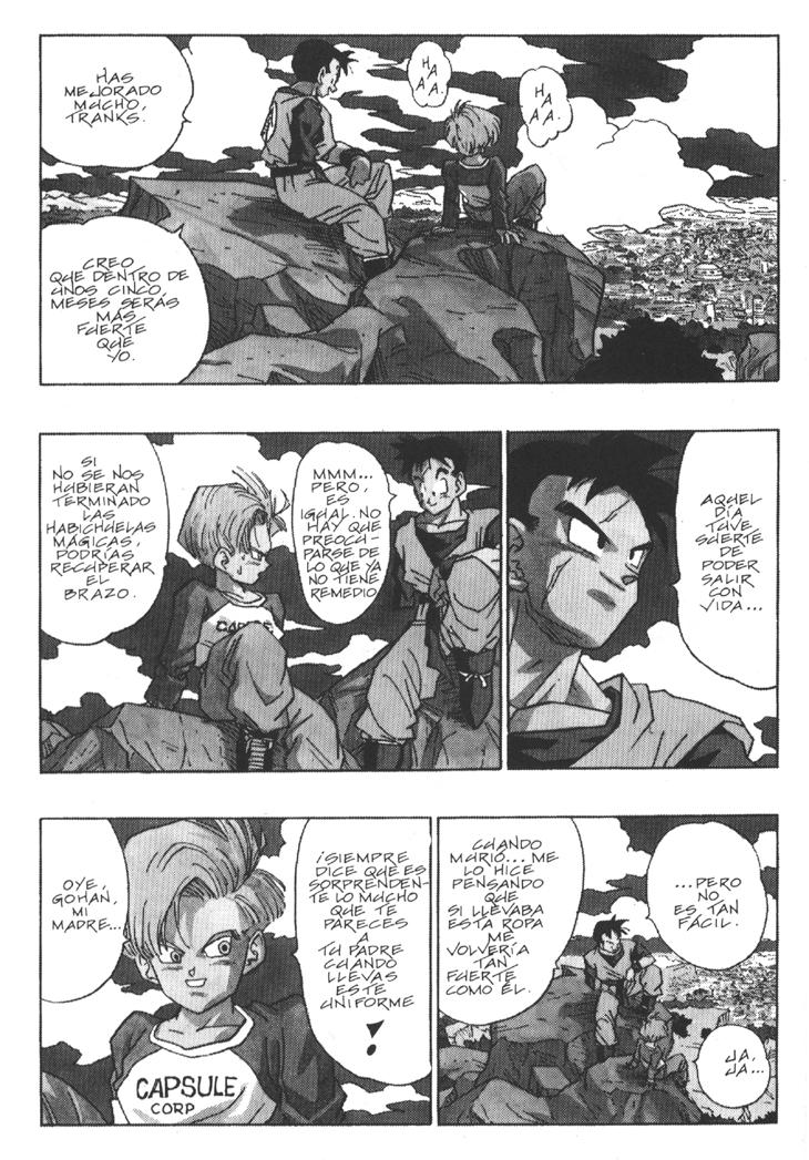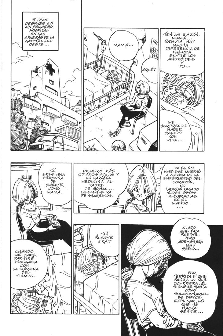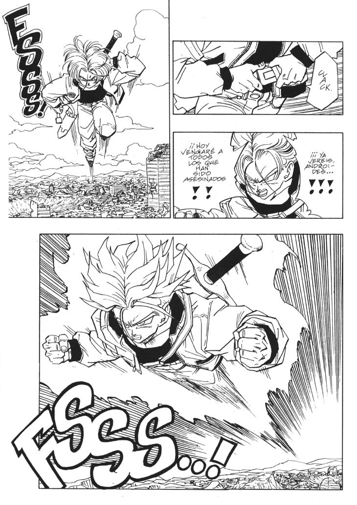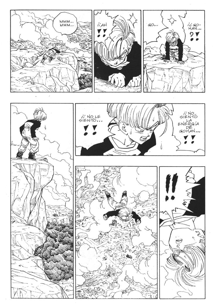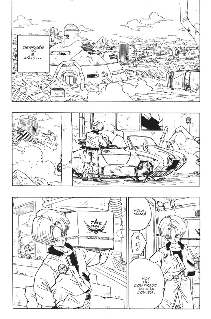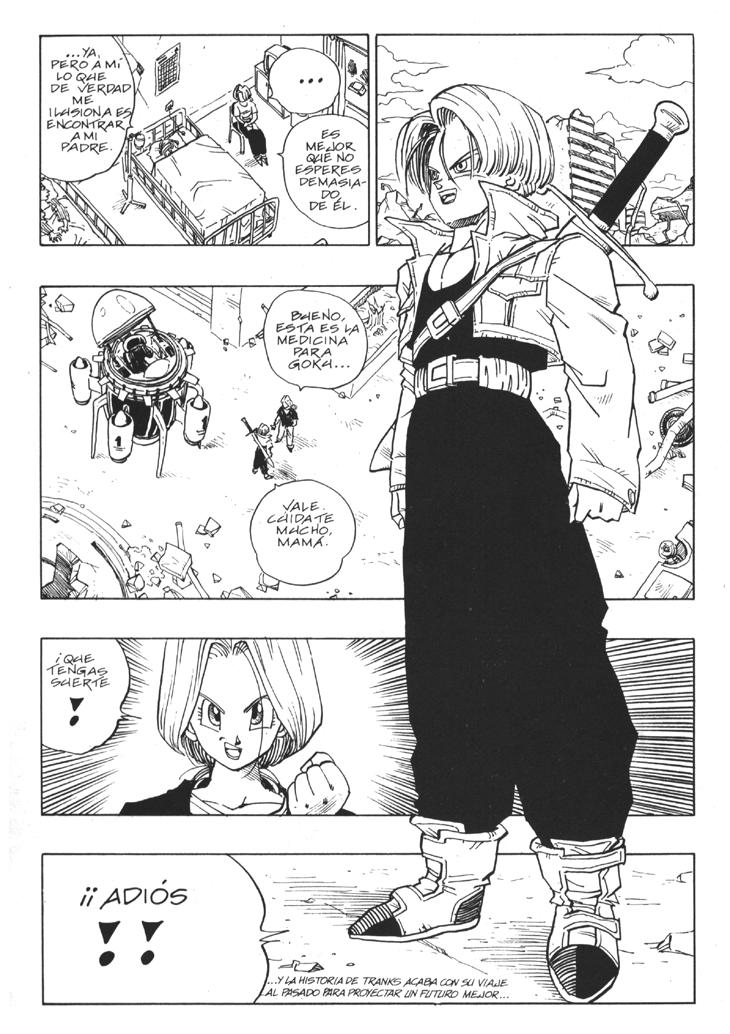 Muchos habeis visto el segundo especial de TV donde se cuenta la historia del futuro devastado por los androides y de como Trunks marcha al pasado buscando una solución. Sin embargo, lo que muchos no sabreis es que esa historia es original de Akira Toriyama, y que fue dibujada por él mismo y publicada al final del Tomo 33 de Dragon Ball. Estas hojas han sido extraidos del Tomo 33 de Dragon Ball, Planeta DeAgostini Comics |